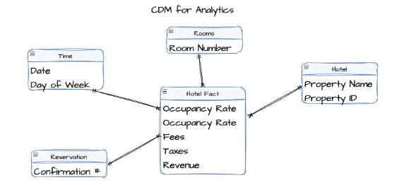 Developing a CDM for a transactional system usually requires understanding the unique requirements for speed, transaction integrity, customer experience, scalability, and ease of use. These types of systems are very common in online retail, reservations, inventory, and even financial services. See Figure 1 and Figure 2 for an example of a hotel.