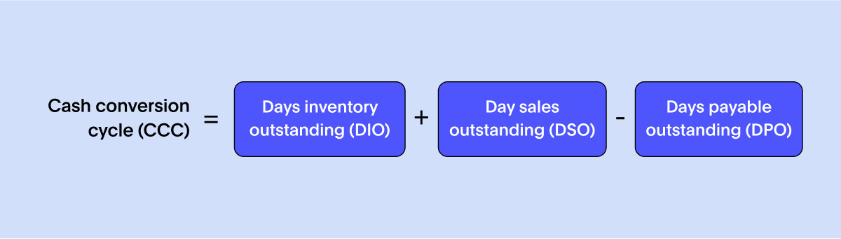 The cash conversion cycle is an e-commerce KPI that measures how long it takes to convert investments in inventory into revenue from sales. Analyzing this metric helps you identify areas where improvements can be made, such as reducing inventory levels and managing payments to suppliers more effectively. To calculate CCC, follow the formula below: