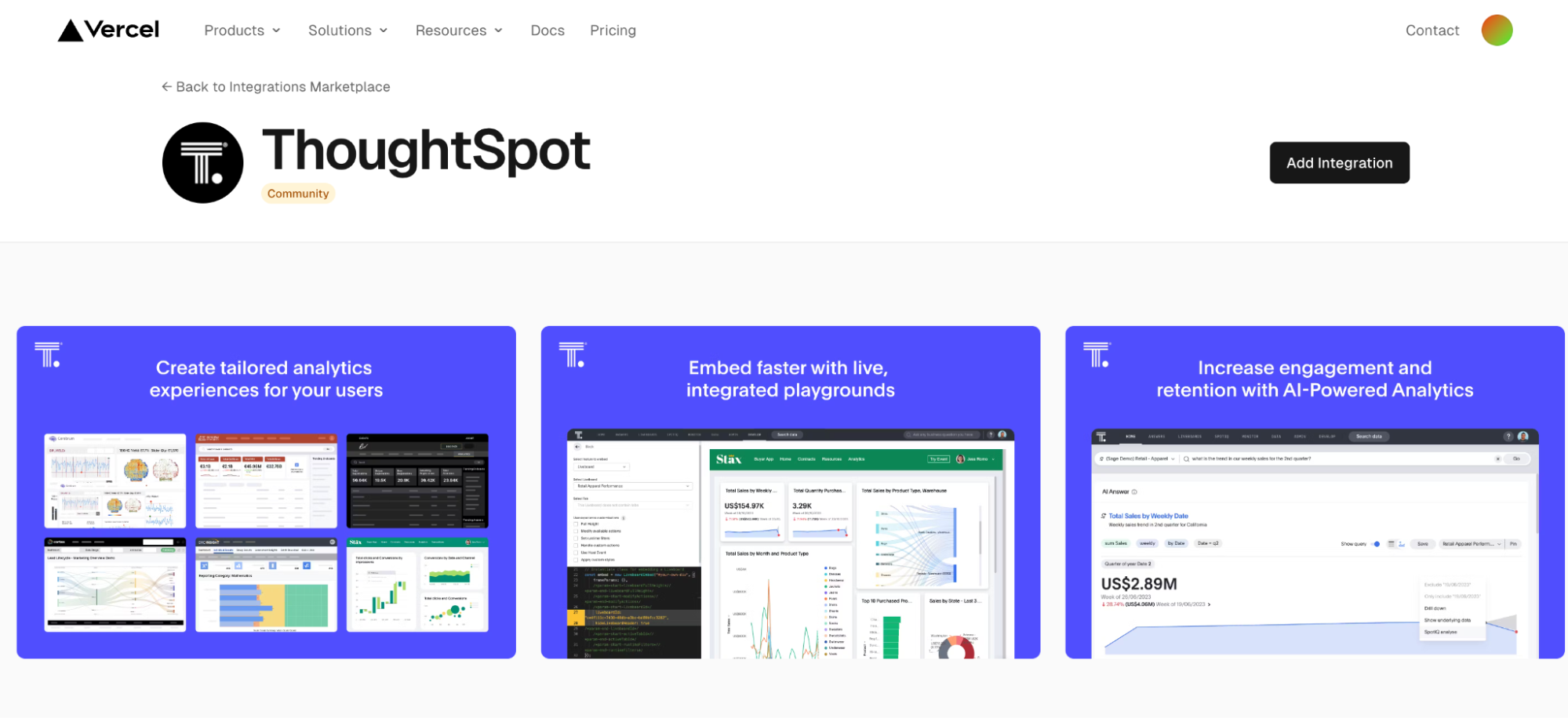 That’s why we recently launched ThoughtSpot Embedded on the Vercel Marketplace. If you’re already a Vercel user, you know that this new app listing helps you quickly embed ThoughtSpot into your apps. And with Vercel handling the hosting and infrastructure, all you need to do is follow the in-listing prompt wizard, and you’ll embed AI-powered analytics into your apps in no time.