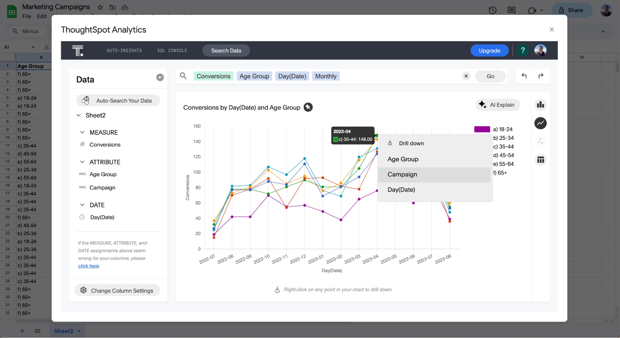 Best of all, ThoughtSpot for Sheets is integrated with Google AI's LLM—giving you access to generative AI at the click of a button. AI Explain is a feature we lovingly dubbed "Google Translate for analytics," because it takes any chart you are viewing in Sheets and automatically delivers the top three data story summaries. In doing so, we’re bridging data knowledge gaps and helping users find new excitement around data exploration—a second core tenant of increasing analytics adoption.